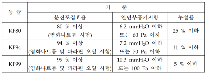 - KF80: 입자직경 0.6 μm을 80% 이상 여과