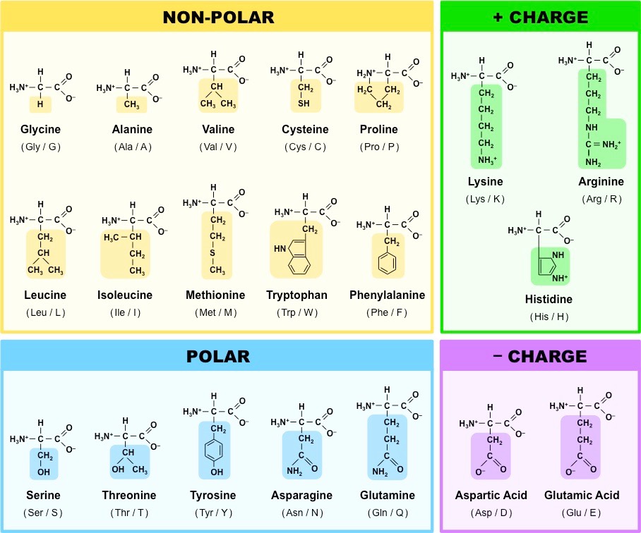 Arginine, Asparagine, Aspartic acid, Cysteine, Glutamic acid, Glutamine, Glycine, Histidine, Lysine, Serine, Threonine